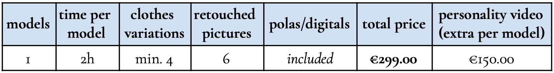 Eine Auswahl an Kleidung steht im Studio zur Verfügung (ausgenommen Schuhe und Unterwäsche) — eigene Kleidungsstücke sind ebenfalls erwünscht